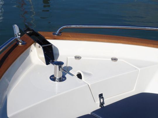 Everything has been designed to maximize circulation on board, with wide side decks, well-placed handrails and easy access to the bow. A locker is located under the console in the bow, with a 12V socket and plenty of storage space for bags and other gear.