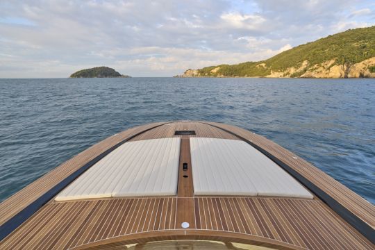 Under the stern sundeck, a 1,800-liter volume makes it easy to store nautical toys and small equipment. The reconfigured sundeck also extends cockpit space. Access on board is via a door on the port side. An outside galley is equipped with fridge, sink, ice maker and induction hob.