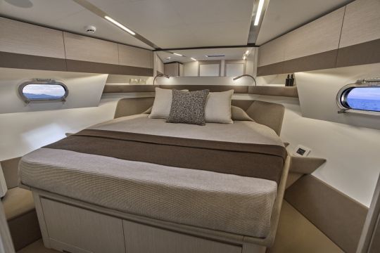 The Itama 54 is designed with two cabins and two bathrooms. The forward owner's cabin features a central bed, side portholes and a deck hatch. It also has a private bathroom. The guest mid-cabin can be configured with a double bed or bunk beds. It also has its own shower room, which can be used as a day toilet for guests.