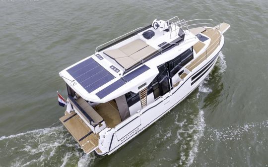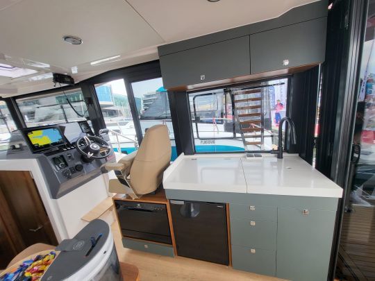 Access to the fly is from the bow, freeing up the stern of the boat for safe movement. The fly features a sunbathing area and an optional helm station. The stern can be fitted with solar panels, an asset for energy autonomy.