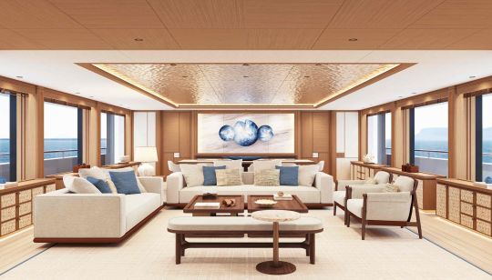 The Light63M adopts an ambience inspired by the Mediterranean basin: natural materials, sober colors, integrated furniture and detachable elements. This approach aims for a high degree of personalization without excessive technical complexity. The layout of the gymnasium, with its panoramic views and skylights, and the private terraces for the owner's suite and VIP cabin, illustrate this desire to offer adaptable living spaces.