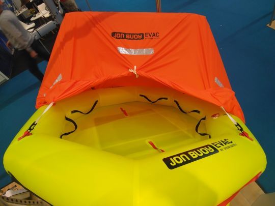 The Jon Buoy EVAC is designed for short-term abandonment situations, when the use of a conventional life raft is not essential. Available in 4- or 6-person versions, it is packaged in an easy-to-carry semi-rigid case. Once triggered, it inflates automatically, offering an arch and canopy for protection, as well as an ascent ladder, assist handles, weighted keel and highly visible colors. The service interval is three years.
