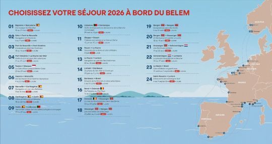 In 2026, the Belem will embark on an extensive tour of French and European ports. From Le Havre to Sète, via Brest, Marseille, Barcelona, Lisbon, Amsterdam and Oslo, there will be numerous ports of call. The ship will visit the shores of the Mediterranean, Atlantic, English Channel and North Sea.