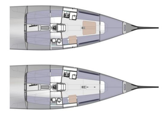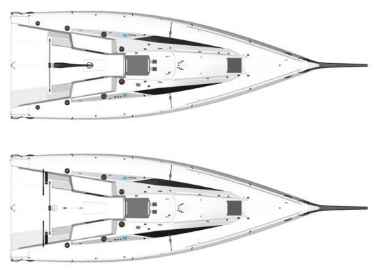 Suitable for both crew and double-handers, the cockpit is uncluttered and designed with racing in mind. It features Harken fittings (black Performa winches, cross-rails, ball-bearing pulleys), as well as custom cleats and chainplates. The helm station can accommodate either a tiller with carbon stick, or a double 900 mm composite wheel helm, at the owner's discretion.