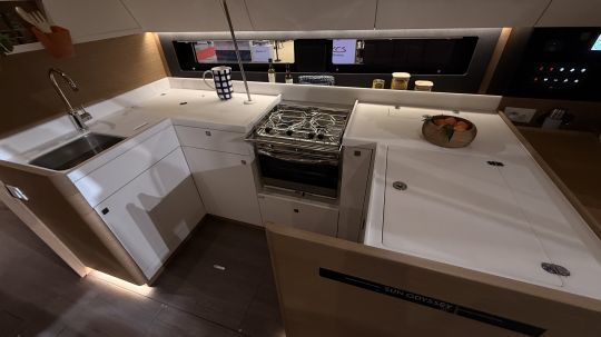 This is undoubtedly the central element of the design: a u-shaped kitchen located to starboard, along the planking. We appreciate the return, which allows the cook to cook even while sailing, well secured, with access to all the equipment.