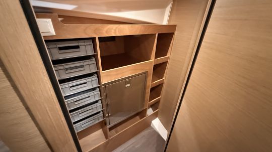 Just behind the chart table, Jeanneau has installed a large, clever storage cupboard with all the drawers you need to store living space or equipment for a long cruise.