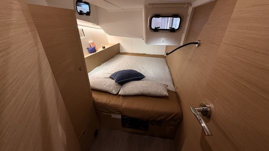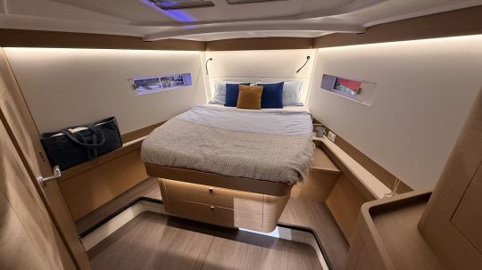 The version visited at the show was a 3-cabin with a forward owner's cabin. The central bed is accessible from both sides, storage space is plentiful and well placed, and the private forward head includes a separate shower. Aft, the cabins are spacious and well ventilated, opening onto the cockpit.