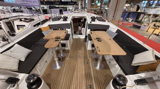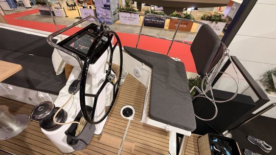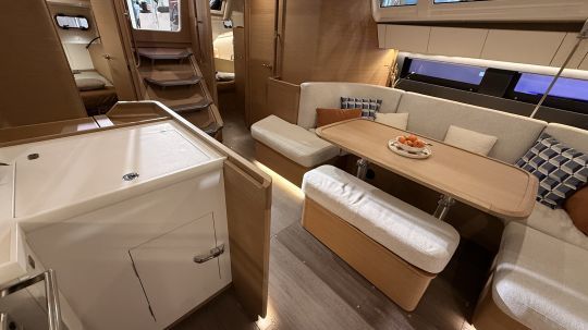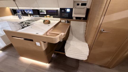 On the practical side, Jeanneau offers a chart table with a special nav' seat. It extends to become a sofa/reader, with even a small headrest cushion on top. Tried in the salon, it seems relevant. To be seen in use at sea.
