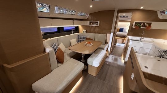 The woodwork is sober, in keeping with the Jeanneau spirit: neither ostentatious luxury nor standardized furnishings. The upholstery is resistant, the handrails well positioned, and the indirect lighting provides discreet comfort.