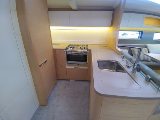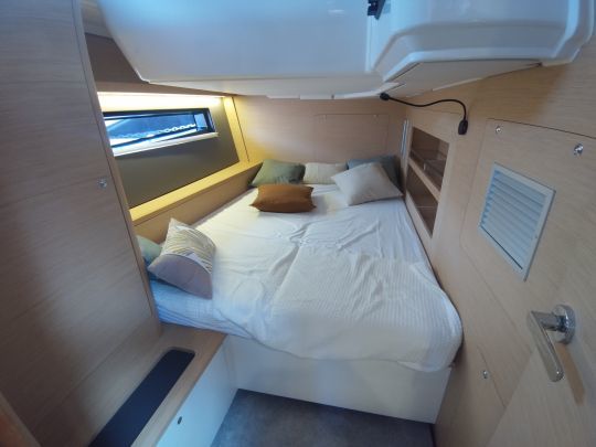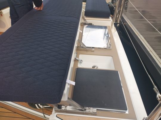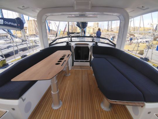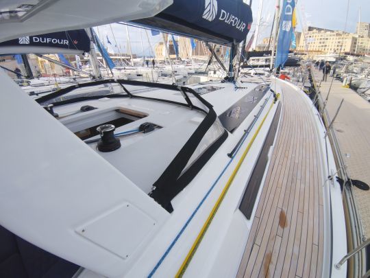Dufour also offers a hybrid version, combining electric motor, reinforced battery pack and generator. Roof-mounted solar panels and the possibility of hydrogeneration complete this energy approach, grouped together under the name ODSea. On-board capacities are consistent with the program. Approximately 450 liters of fuel and at least 450 liters of fresh water, figures well suited to extended cruising.