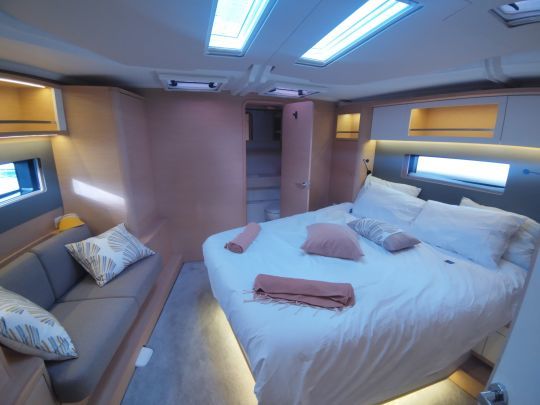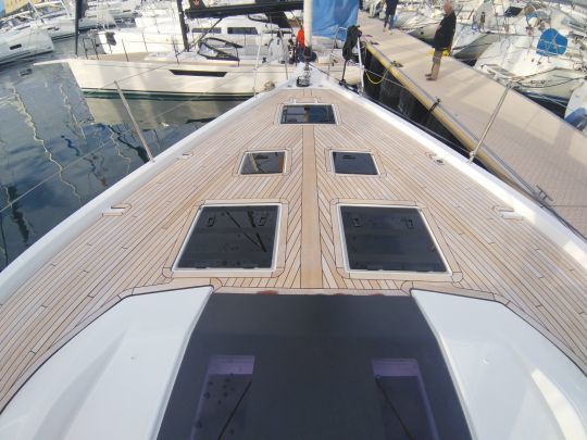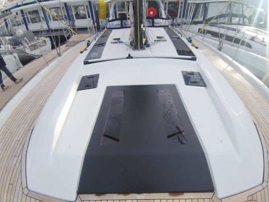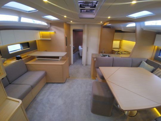Below deck, the Dufour 54 relies on natural light, light surfaces and good ventilation. Numerous deck hatches provide plenty of air and light both at anchor and at sea.