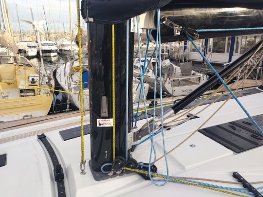 A rail-mounted self-tacking jib is standard on the bow, while an overlapping genoa is available as an option, with the clews set into the cabin structure. This choice gives the owner the freedom to orientate the boat towards simpler or more committed sailing.