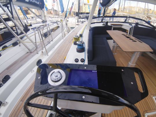 The helm stations remain well clear, with good freedom of movement for the helmsman. In the standard configuration, maneuvering is carried out forward of the companionway. Sheeting winches on the aft coamings remain available as an option for those who prefer more direct steering from aft.