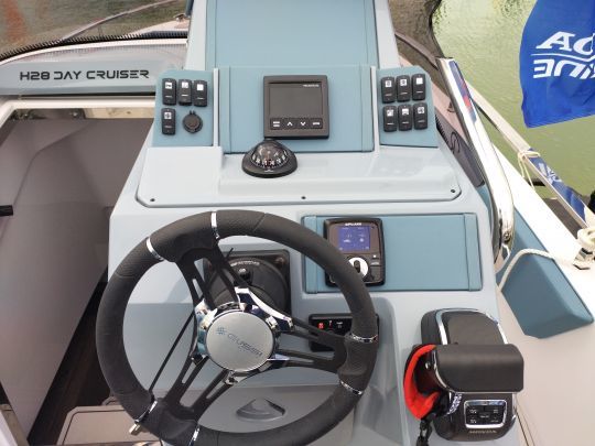 Below deck, the 4XC H28 offers an enclosed cabin, a feature still uncommon on some day cruisers. There's enough space for two berths for a night on board. Headroom remains moderate, but sufficient for occasional use.