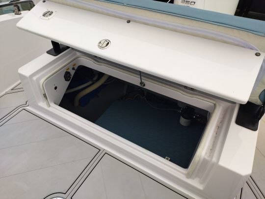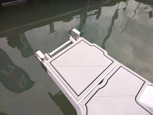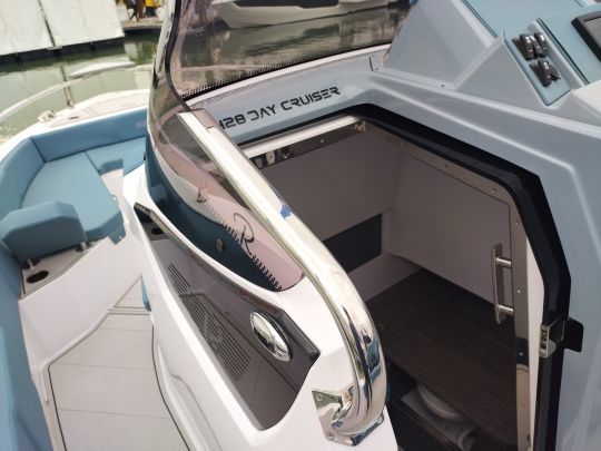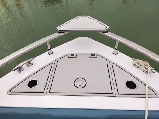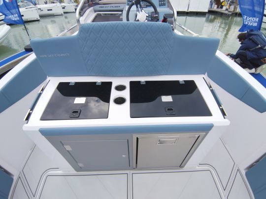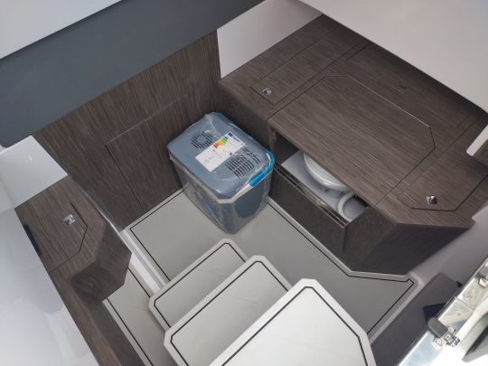 The cabin features ample storage space and separate electric toilets, with privacy enhanced by tinted windows. A layout that opens the door to multi-day outings, without turning the boat into a permanent cruiser.