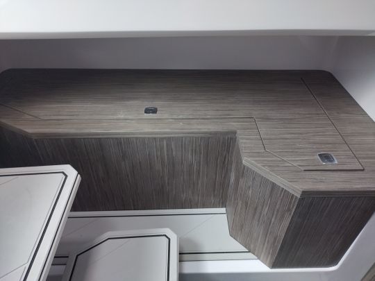 Forward, the deck features a convertible saloon. Removable table, modular cushions and removable backrests allow you to quickly switch from dining to sunbathing. The storage lockers under the seats offer a substantial volume, linked between the bow and the stern.