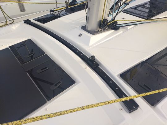The optional hard top changes the way the boat is used. Protection is noticeable upwind and downwind, and the roof windows make it easier to read the sails from the cockpit. The cut-out of the hard top is designed to allow easy movement without bending, while keeping an eye on the trim.