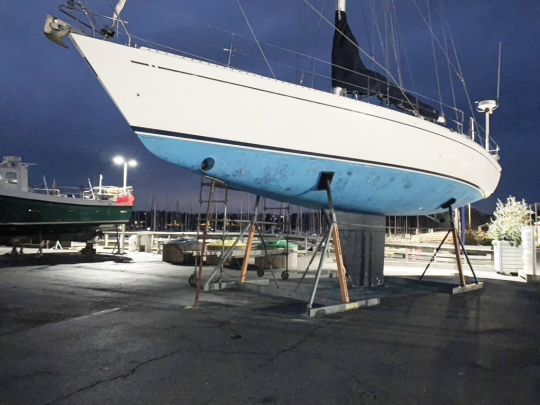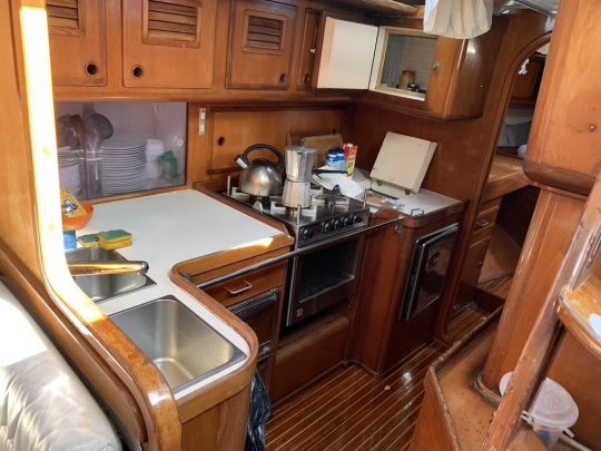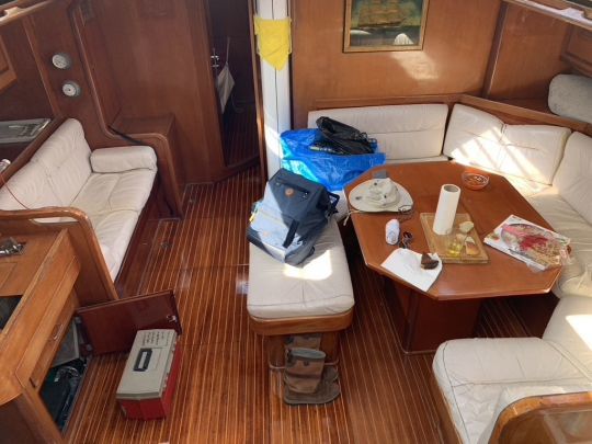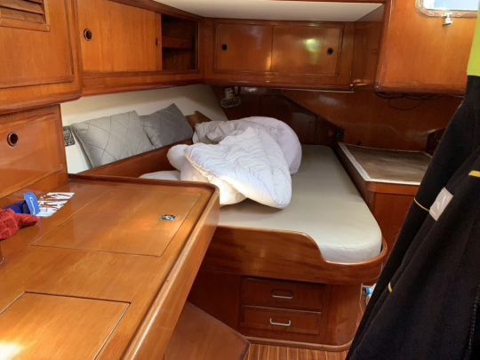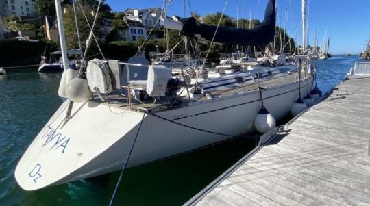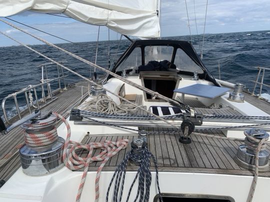The Nauta 54 belongs to this generation of elegant ocean cruisers, designed to sail far, heavy and long. With a displacement of 17.60 t and a draught of 2.80 m, Tayya's proportions emphasize stiffness and stability. The thick hull, by the standards of the late 1980s, accepts stress without sudden reactions.