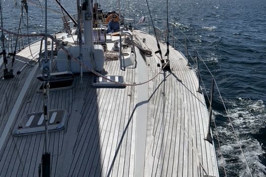The teak deck, refurbished in 2013, offers unobstructed, safe circulation. The two cockpits provide excellent protection for the crew, reducing fatigue on long watches. The three-spreader aluminum mast, repainted in 2021, can carry a substantial sail area, up to 330 m² downwind, while maintaining well-distributed loads. The yacht is fitted with a genoa, but can also be rigged as a cutter with a yankee and a tranquette.