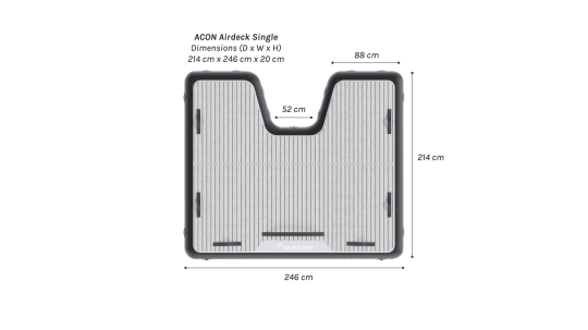 To increase outdoor space, Yamarin and Acon offer an inflatable floating platform that attaches to the transom. This Airdeck is designed to create an additional area at water level, without modifying the boat's structure.