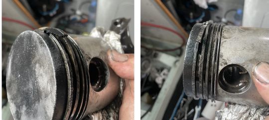 I release the crankshaft, one hand to push from inside the engine, the other to retrieve the outgoing piston. And there it is... Side A: nothing to say, but side B: the die is cast. The piston is broken between 2 rings!