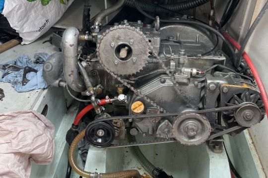 The engine hold of the Nicholson 33 is blessed for its access. Access around the engine is perfect, provided you're willing to live in a total boatyard, with no lowering block. The diagnosis was made by the previous owner and the shipyard that took care of it: if the engine won't start unless Start Pilot is injected, it's because it's suffering from a compression problem.