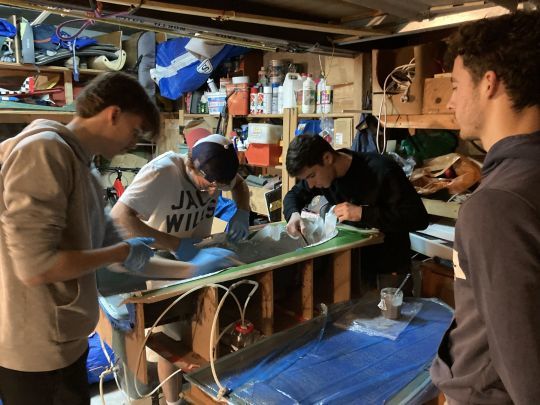 Production then follows at a steady pace. A whole week is devoted to the structure of the mold, then the hull is built in four weeks, in the evenings after school. Initially led by Matthis during the preliminary studies, with the support of his three friends, the project became everyone's business when the N1 hull took shape in the mold. Together, they drape the first hull, then assemble it.