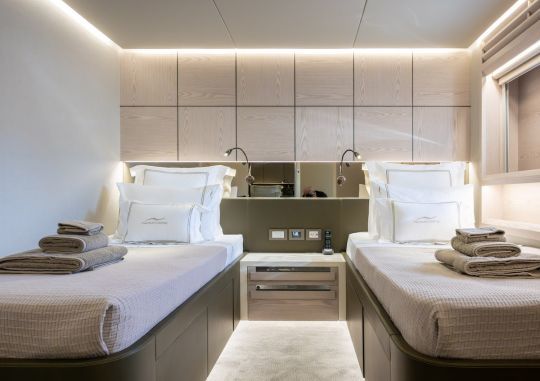The interior layout features six cabins for twelve passengers, with an owner's suite on the main deck. Two cabins offer interesting modularity. They can be used as children's bedrooms, offices or additional cabins.