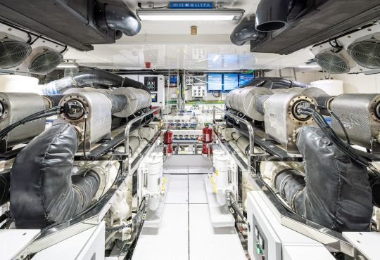 Propulsion is provided by two 800 hp MAN engines, with an option for 900 hp. A classic choice for a yacht of this tonnage. It favors reliability and controlled fuel consumption at moderate speeds.