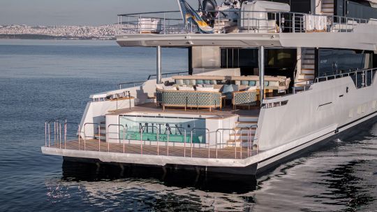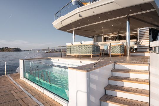The stern is the focus of much of the design. Three levels lead from the cockpit to the bathing platform. There is a dining area, a lounge area with pool, and direct access to the sea.