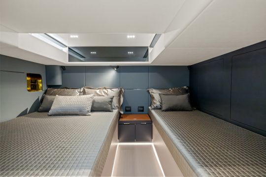 The standard layout includes two cabins and two bathrooms. The owner's cabin has a separate shower area. The guest cabin offers a double berth complemented by a single bed.