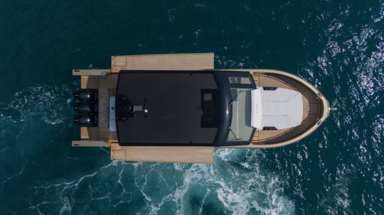 This configuration frees up the transom, allowing the integration of a larger hydraulic platform. The space can be used for bathing or as a tender.