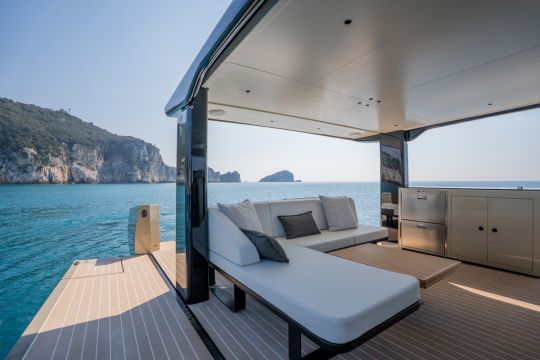 Access to the water is via a retractable gangway integrated into the transom, which can be submerged. The side platforms also serve as bathing areas, with integrated ladders.