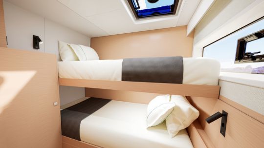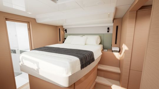 The owner's cabin features a bathroom with double sinks and well-distributed storage space. The Smartroom in the port hull offers interesting modularity. It can be used as a cabin, dressing room or technical area, meeting the varied needs of owners and charterers alike.