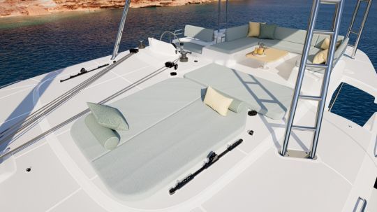 The 12 m2 forward cockpit becomes a true extension of the saloon. Its direct access changes its use, making it ideal for resting or keeping watch. The flybridge adds a third level with a relaxation area and a raised helm station, increasing both the usable surface area and the windage.